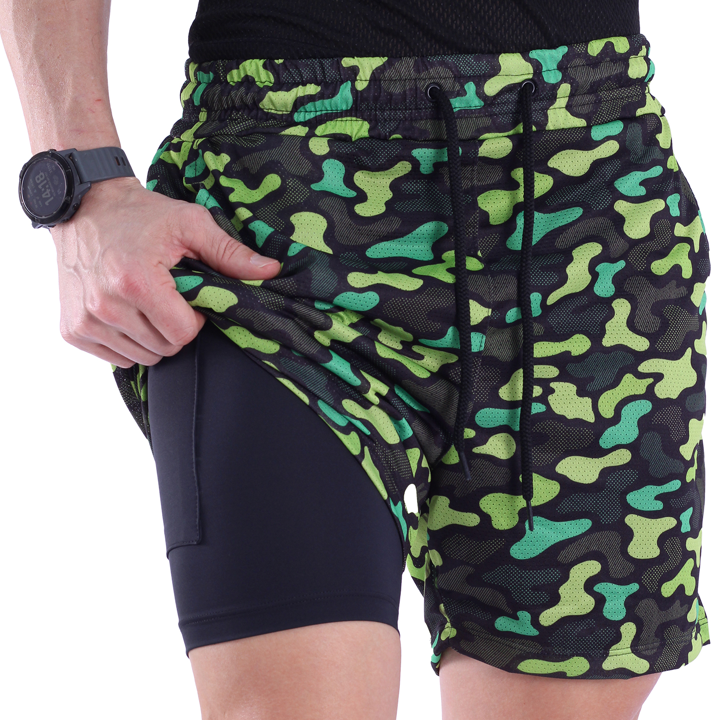 Bermuda Dupla 2 Em 1 Compressão com Suporte Toalha e Bolso Interno MXD Conceito Camuflado Selva Neon