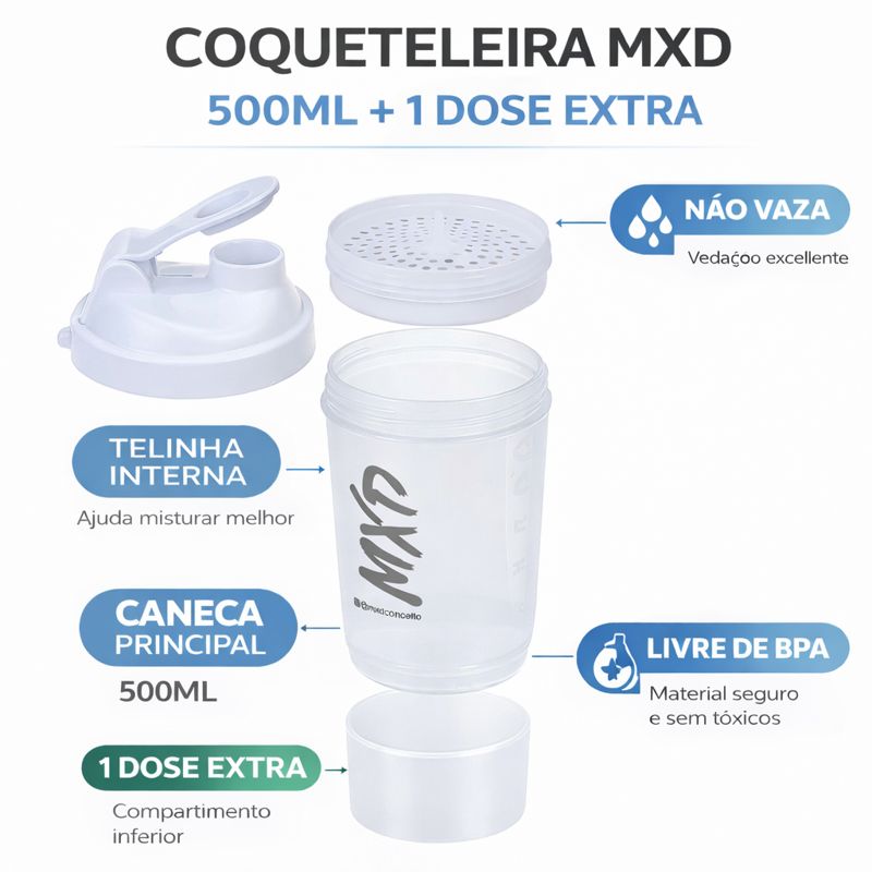 ✔ Copo principal com capacidade de 500ml, ideal para água ou shake