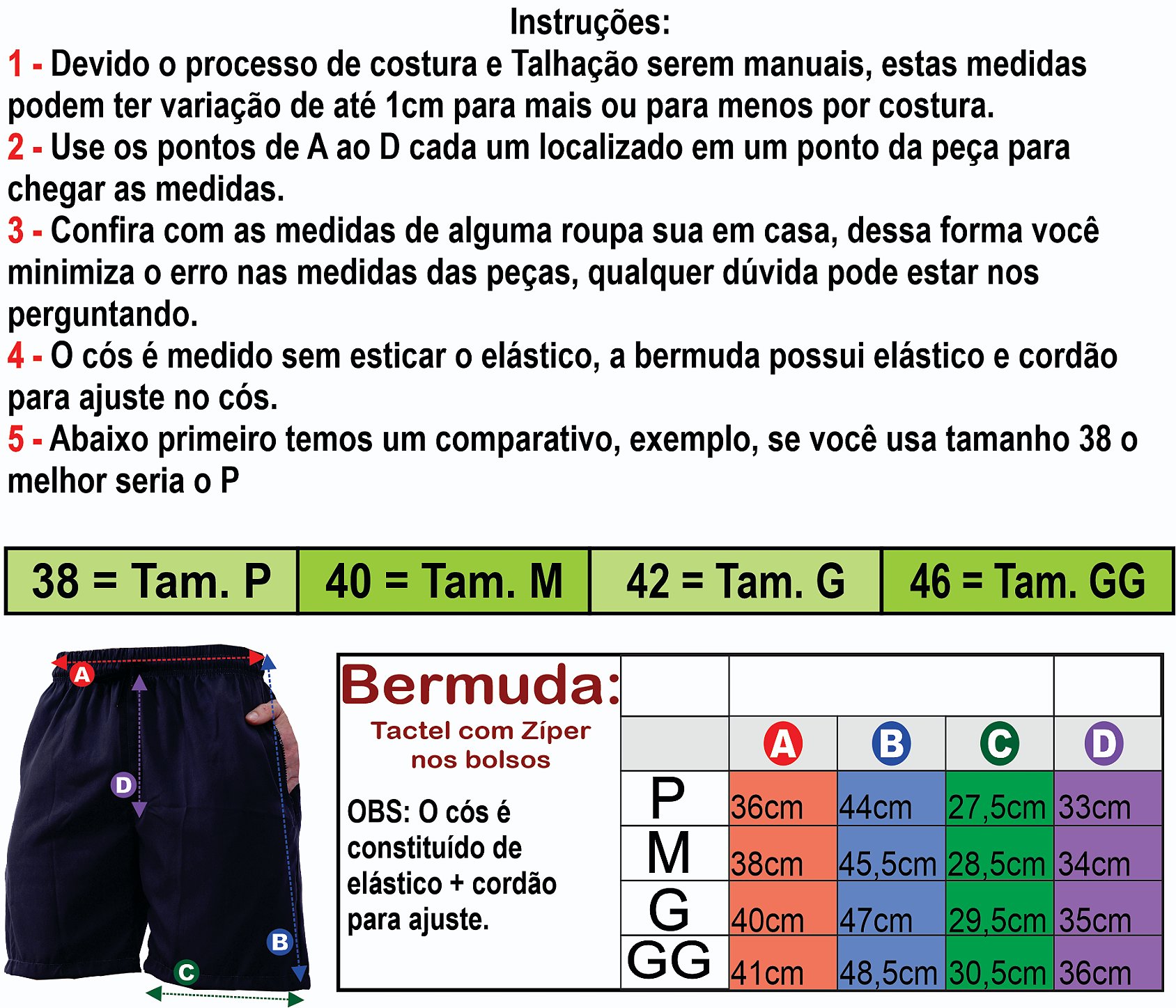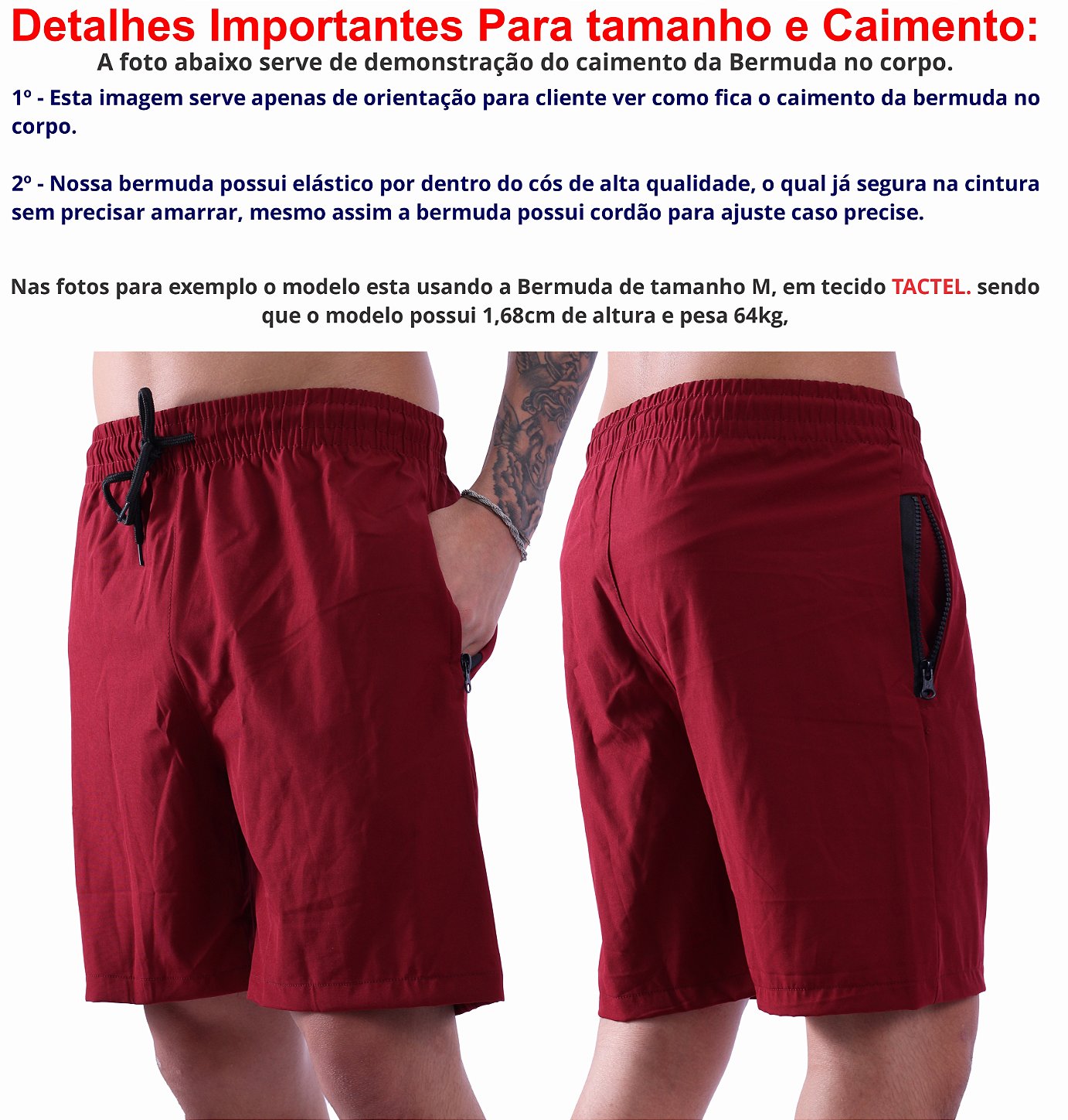 3-Todas as bermudas possuem Bolsos Laterais com zíper e Cordão para ajuste;